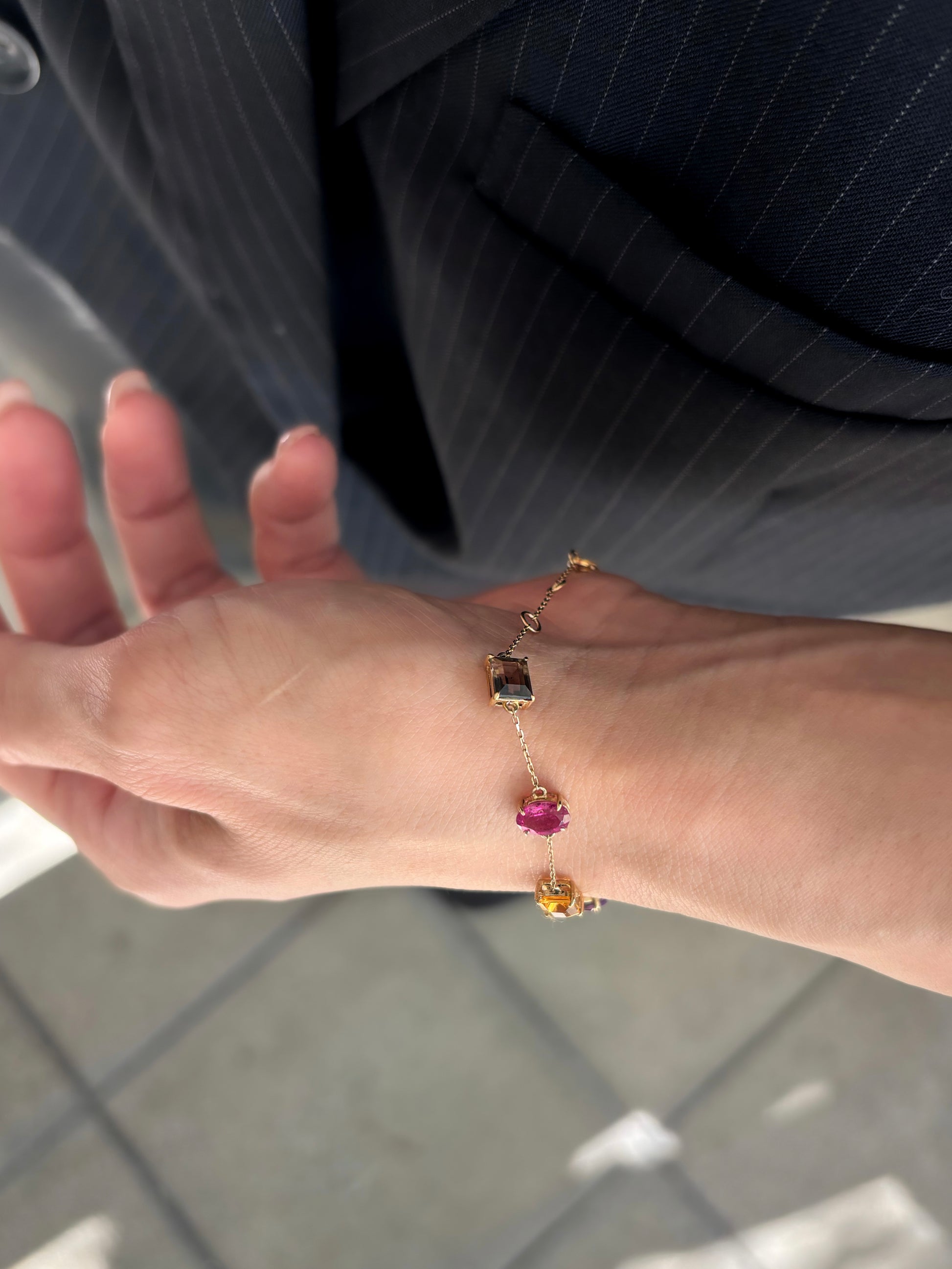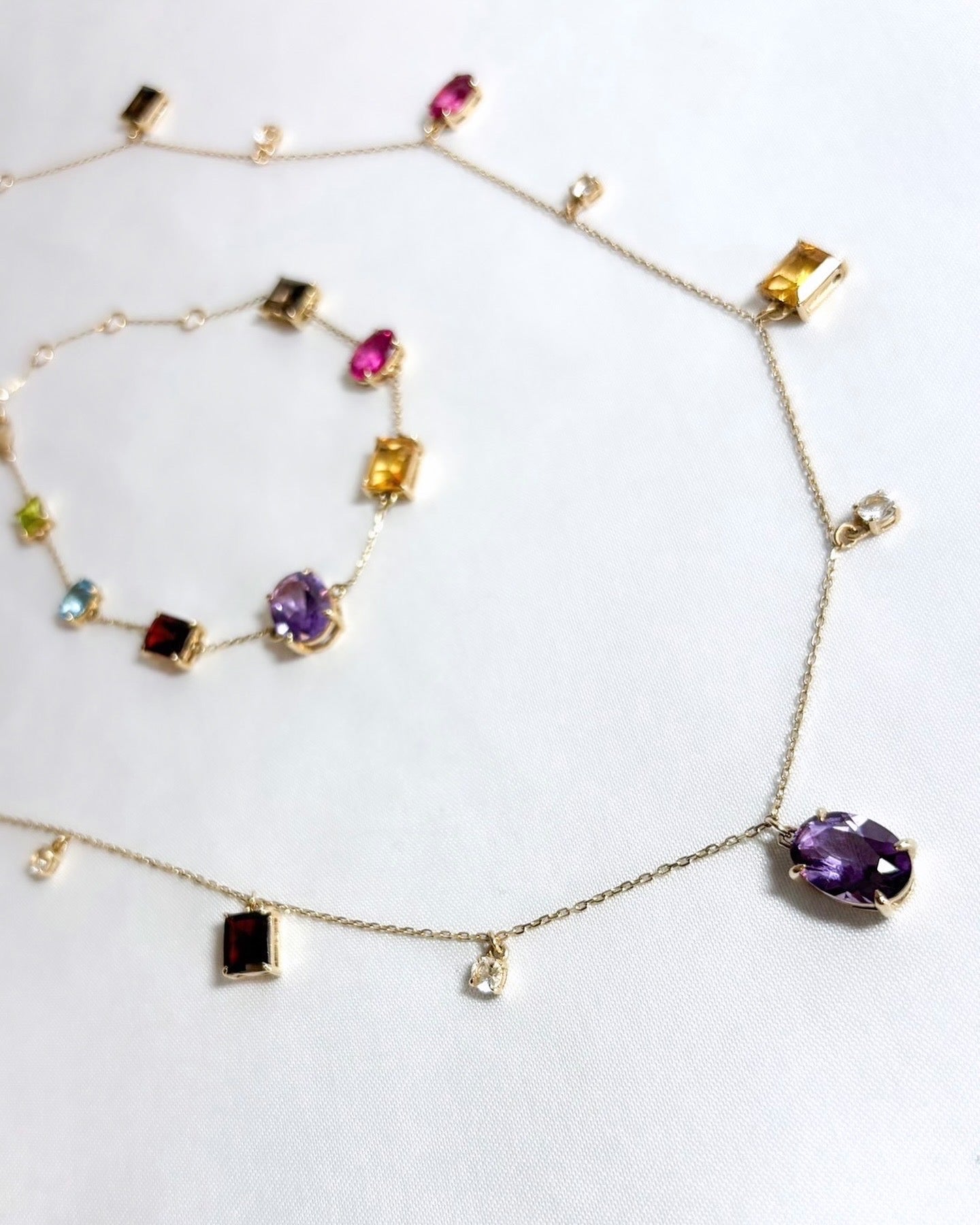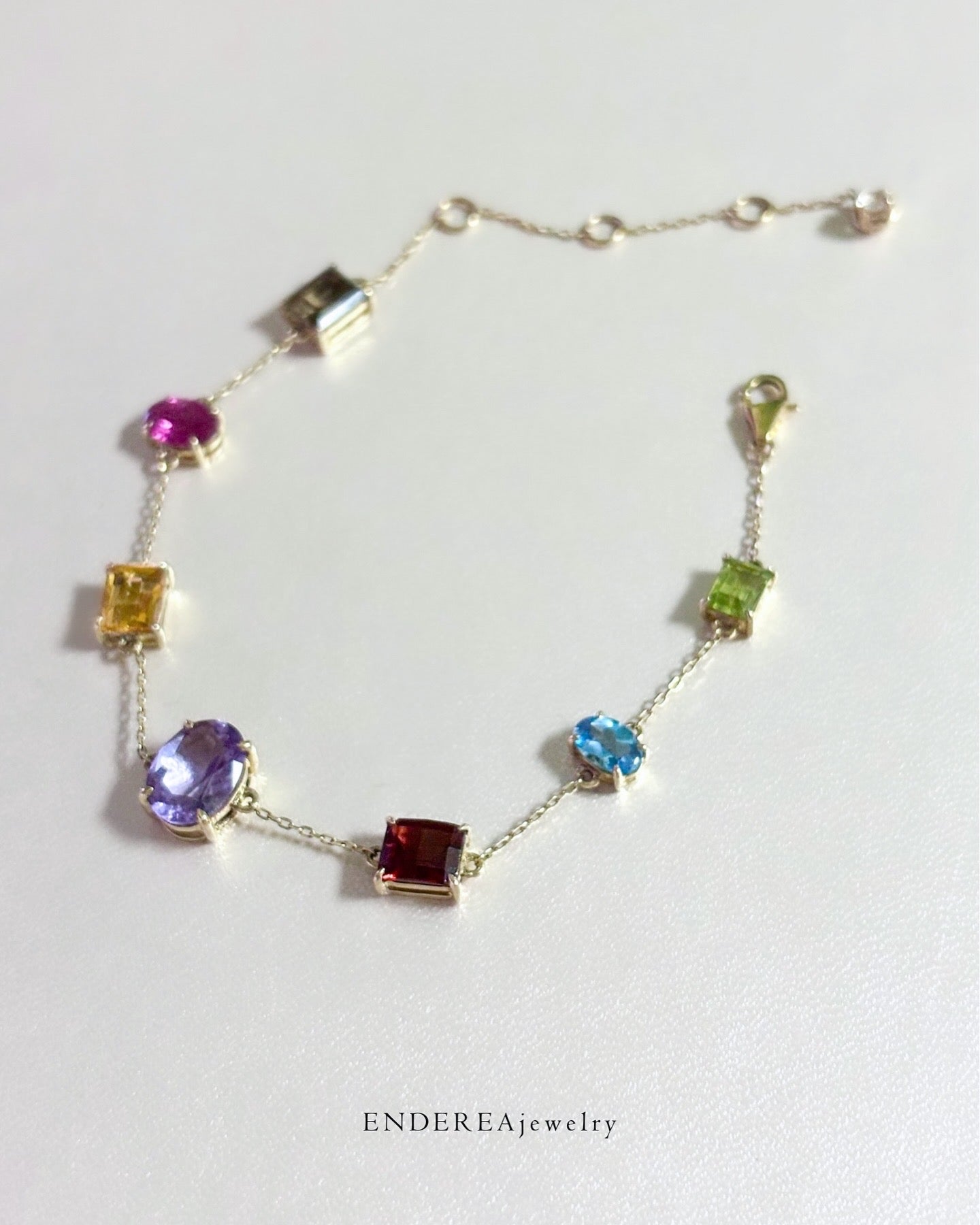 マルチなカラーとカットで構成された7色の天然石 (bluetopaz, pinktourmaline, amethyst, peridot, citrine,smokyquartz, garnet)がポップなジュエリーチャームのように目を惹く可愛らしさ。