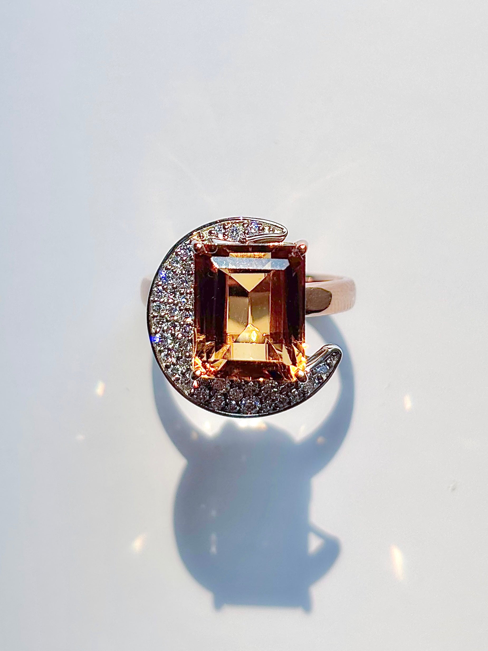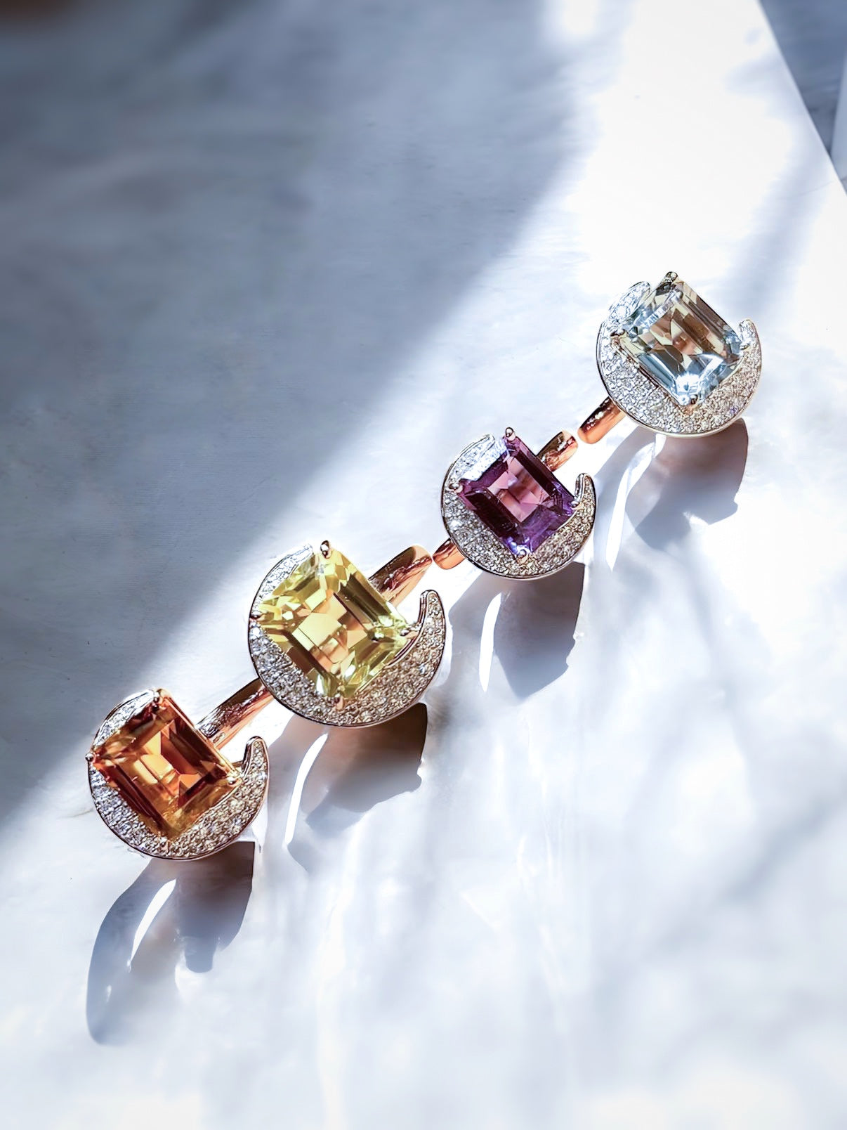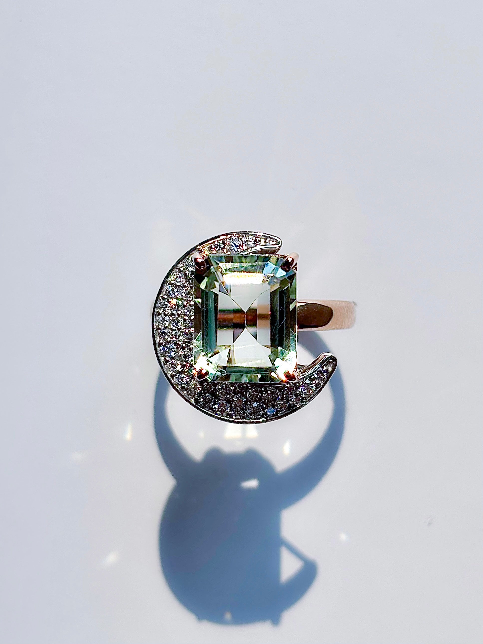 立体的にかたどられた月と、選び抜かれた天然石が放つ美しさとエネルギーが溢れ出すお月様のリング。夜空に浮かぶ月は、上弦から下弦へと姿を変えながら、私たちの心にも変化と進化をもたらしてくれます。