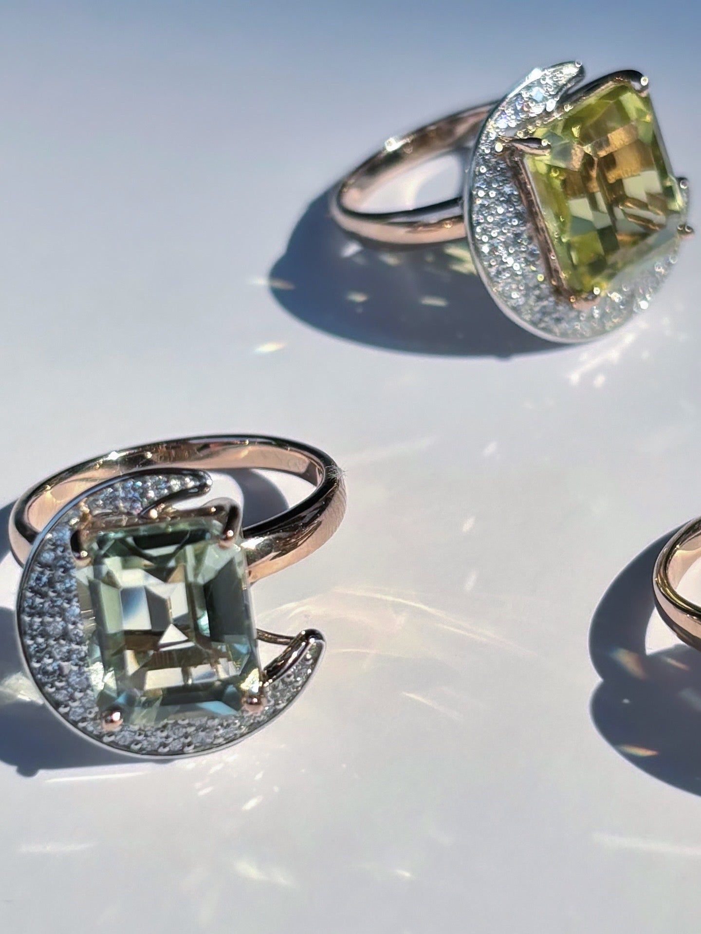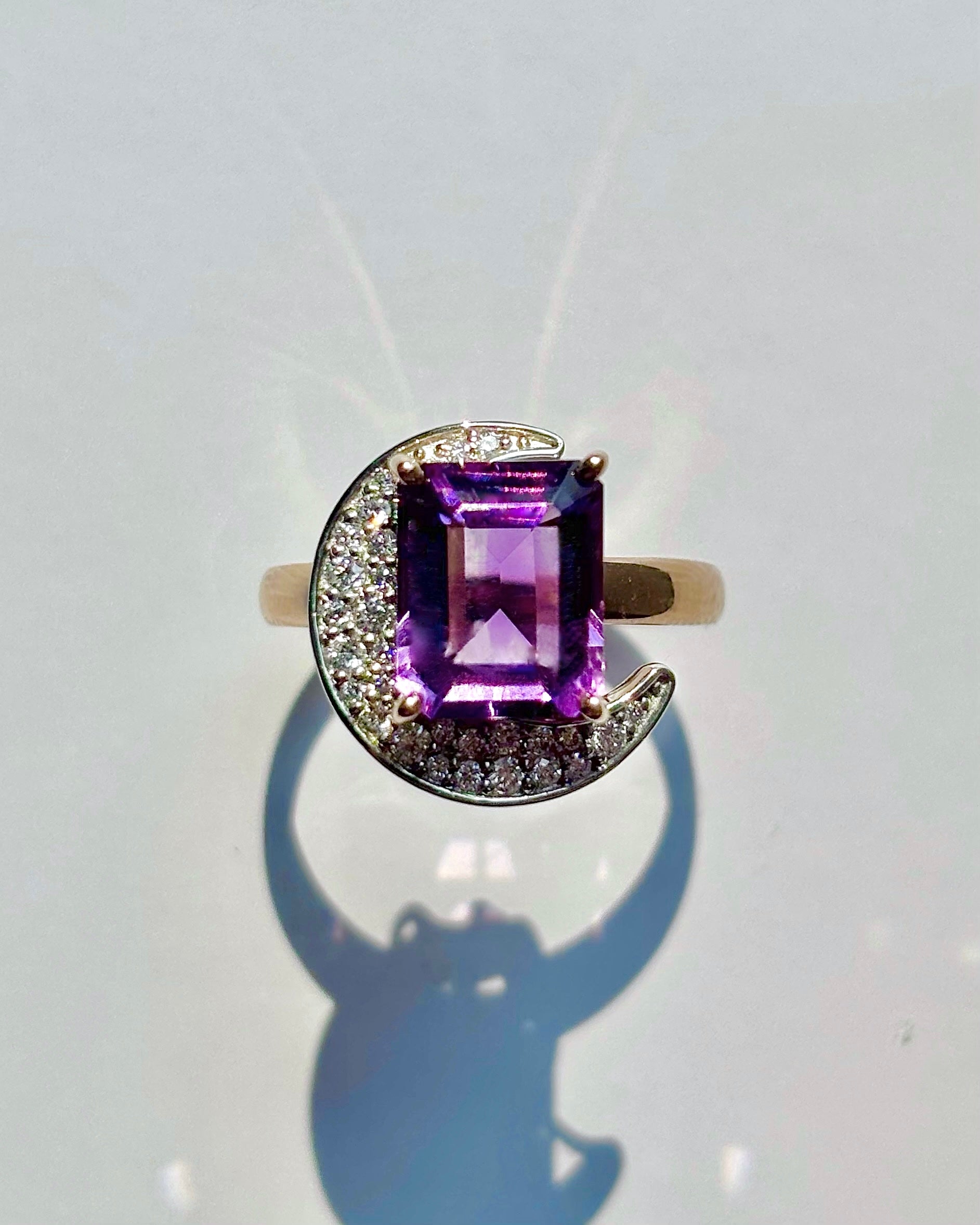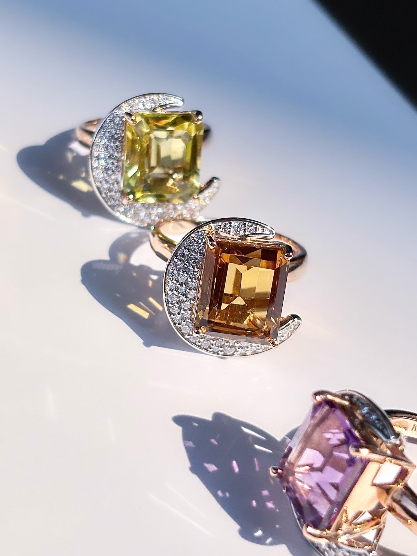 立体的にかたどられた月と、選び抜かれた天然石が放つ美しさとエネルギーが溢れ出すお月様のリング。夜空に浮かぶ月は、上弦から下弦へと姿を変えながら、私たちの心にも変化と進化をもたらしてくれます。