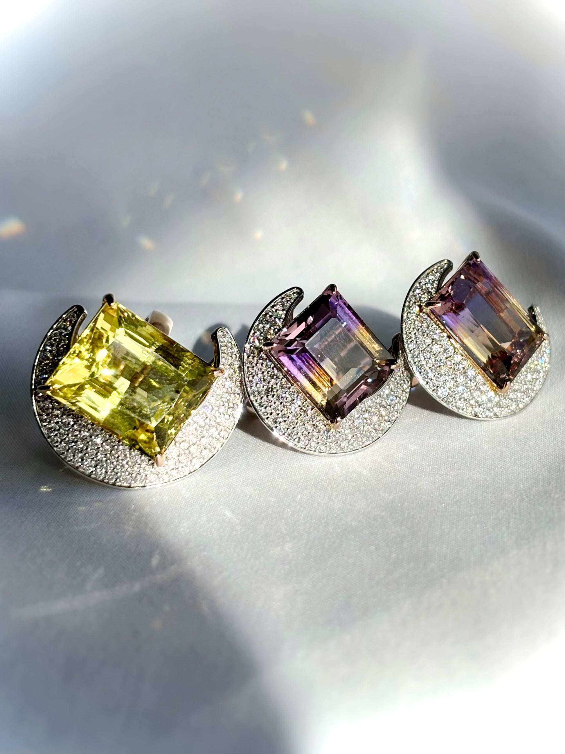 立体構造の月と天然石の美しさとエネルギーが溢れ出し、エンデレアのボリュームたっぷりでありながらも付けると驚くほどオーバーにならずに綺麗に指に落ち着くセッティング。瞬く間に、そこにロマンティックな空間が広がる〜